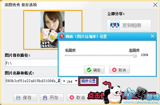 用美图秀秀处理好图片,单击“保存”按钮,弹出“美图秀秀保存选项”窗口,细心的朋友会发现新版美图秀秀新增了一个“画质设置”按钮,单击这个按钮,弹出“画质(图片压缩率)设置”小窗口,向右拖动滑块,将画质设置为100%,然后保存图片,就可以生成可以和PS媲美的高品质图像。