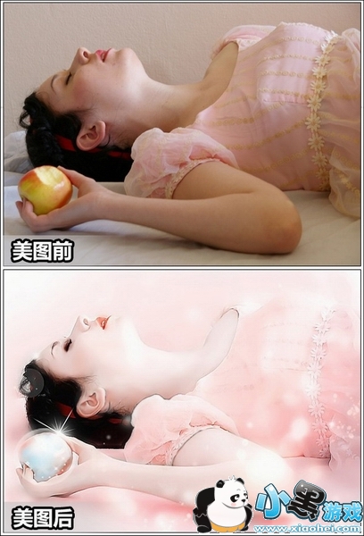 先看看对比效果图: 图1要做这样的仿手绘效果,首先要选好素材,比如一些像素较高、较为清晰的照片,然后根据照片来定义效果。赶快选好照片,跟着我们一起来做做看吧:1、在软件下打开待处理的照片,进入“美容”菜单下,选择“皮肤美白-美白高度”,提亮肤色。 图22、接着选择“磨皮祛痘”功能,点击“超级磨皮”可以一键柔化皮肤。 图33、返回“美化”菜单下,选择“热门”特效分类下“锐化”,可以一键调节清晰,加强细节。 图44、然后选择“时尚”特效分类下的“阿宝色”,轻松更改照片的色调。 图55、再选择“炫光”特效分类下“拣光”,可以增加光照的效果。 图66、继续在“美化”菜单下,选择“局部变色笔”功能,选择合适的颜色进行涂抹,主要以粉色系为主,黑色涂抹毛发,可以让色彩更加唯美梦幻! 图77、在到“饰品”菜单下,点击“非主流印”分类,在右侧素材缩略图中,选择气泡素材,添加在苹果周围,并调整其角度、大小、透明度,就大功告成啦! 图8再看看最终效果图: 图9总结:柔美的色彩和线条是仿手绘效果的法宝,其实,除了仿手绘的效果,我们还可以赋予一张普通的照片其他的艺术效果,有了“美图秀秀”这样简单又好用的图片处理小助手,大家可以随意发挥自己的想象力,进行最个性的图片创作吧!