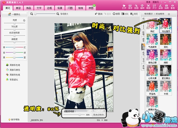 第三步:再应用一个“对比强烈”特效,透明度80%,加深图片的明暗、深浅对比。