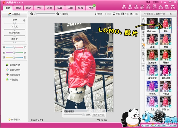 第二步:运用“LOMO”中的“胶片”特效,透明度为100%。