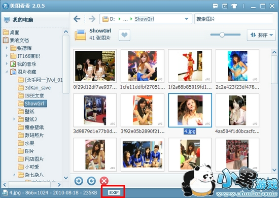 2、在图片管理窗口,当选中包含EXIF信息的图片时,窗口下方状态栏上会出现“EXIF”按钮(如图3),单击这个按钮,即可叫起“图片信息”窗口,查看该图片的EXIF信息。