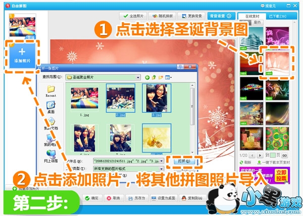 2、当跳转到拼图界面时,可在右侧背景素材展示区,点击选择应景的圣诞背景图。然后再点击“添加照片”,将其他拼图照片导入。