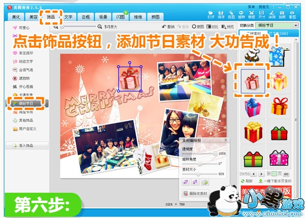 6、最后,再到“饰品”菜单下,在“缤纷节日”分类下,选择一个圣诞节的饰品素材,虽然素材很多,但是要依照图片的色调选择一个合适的素材即可,能起到画龙点睛的作用就好。