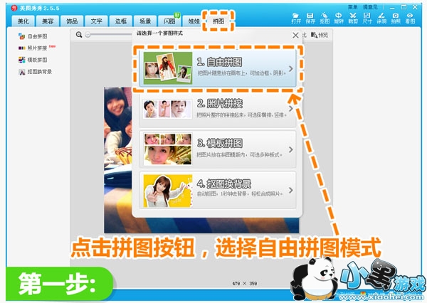1、首先启动“美图秀秀”软件,打开一张照片,直接进入“拼图”菜单下,选择“自由拼图”模式。