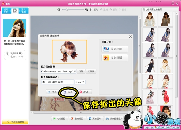2、利用左侧实例图的提示,仔细用鼠标将头像抠取出来。抠好后点击“保存抠好图片”,将抠出的头像保存起来。