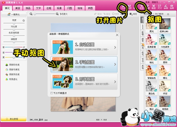 1、首先在“美图秀秀”软件下,打开一张自己的照片,并点击界面右上角的“抠图”按钮,在跳出来的菜单中选择“手动抠图”模式。
