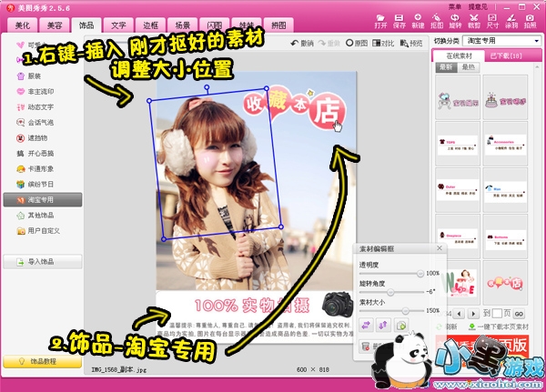 3、接着到“饰品”菜单下,给原来的照片添加一些“淘宝专用”的素材。并对照片点击鼠标右键,选择“插入一张图片”,将刚才抠好的素材添加进来,并调整其大小位置。为了让摇头晃脑的效果看起来富有喜感,可以将头像调的比之前大一点。