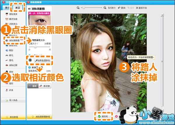 1、启动“美图秀秀“软件,并打开待处理的生活照。进入“美容”菜单,选用“消除黑眼圈”功能。选取周围相近的景色,先将抢镜的路人甲抹掉吧。