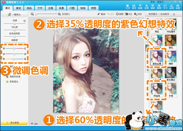 3、然后在“时尚”特效分类中,执行透明度为60%的“阿宝色”以及透明度为35%的“紫色幻想”特效。