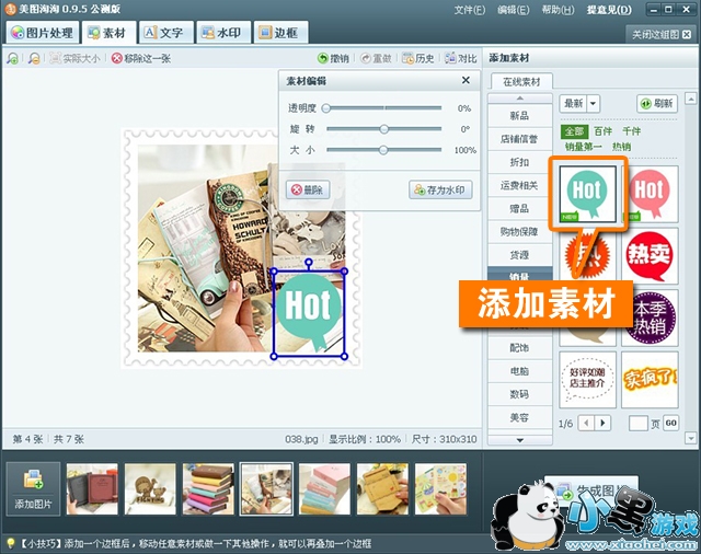 STEP3:当然,为了进一步增加节日宣传的效果,还可以在“素材”功能标签下,选择恰当的宣传/促销素材,比如“热卖”、“HOT”、“卖疯了”等等,如图4所示。大家就随意发挥吧!