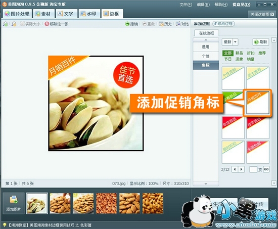 第三步:单击 “角标”按钮,切换到“角标”素材窗口,这里角标的种类很丰富,找到自己喜欢的角标,并单击效果图,为网店商品图片添加促销角标(如图6所示)。