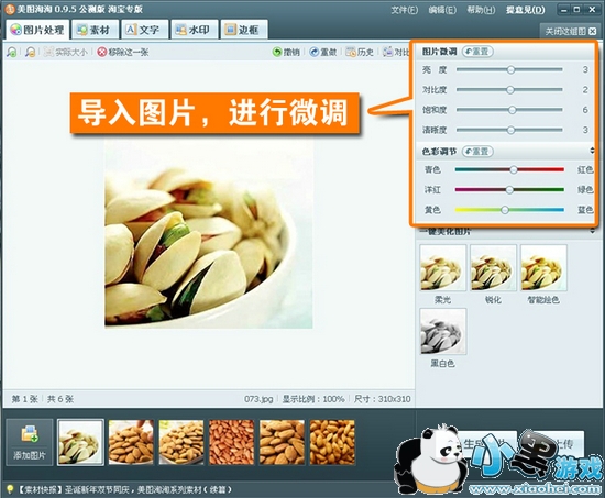运行美图淘淘,批量导入商品图片,然后调整图片的亮度、对比度、饱和度、清晰度,以及图片的颜色。食物图片一定要勾起人的食欲才能激发购买欲望,一般偏暖的色调看起来让人比较有食欲(如图2所示)。