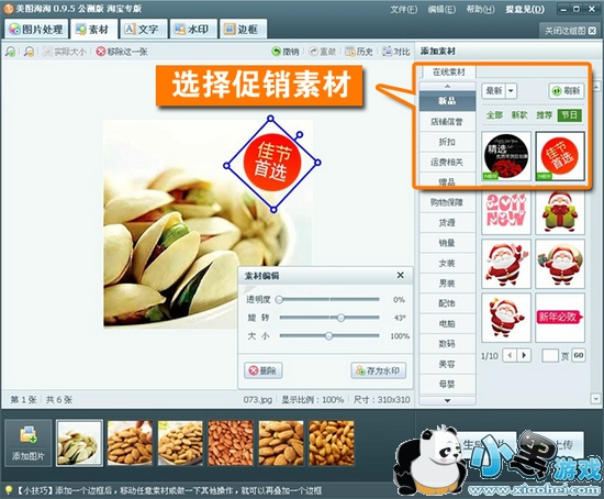 调整好了图片色调就可以添加素材了,淘淘不仅有专门的节日促销素材,在“其他”分类中还有食品类的素材供大家选择,轻松为食品类网店图片添加时尚素材。