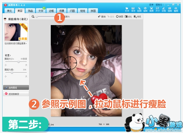 2、进入“瘦脸瘦身”界面后,用鼠标将脸部边缘往内侧拉动,就会发现脸真的有变瘦哦!不过这个瘦脸操作起来要仔细一点,不然变形的脸就不好看啦!