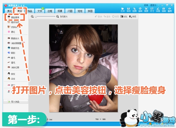 1、在“美图秀秀”软件中打开一张待处理的照片,大饼脸和那些烦人的雀斑怎么也看不出明星相。不过别着急,我们可以先美美容,进入“美容”菜单下,选择瘦脸瘦身功能。