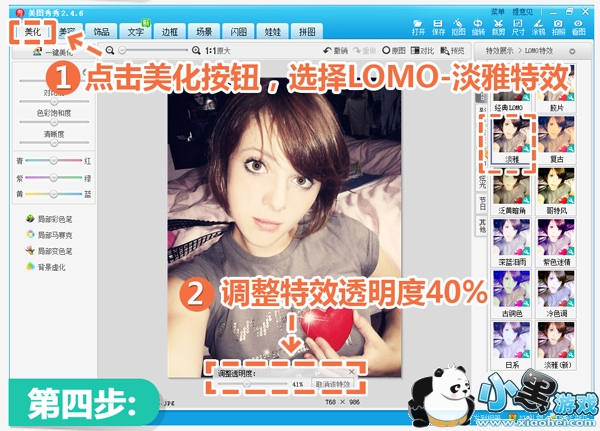 4、然后返回“美化”菜单下,选择LOMO-淡雅特效,适当调整其特效透明度到40%。