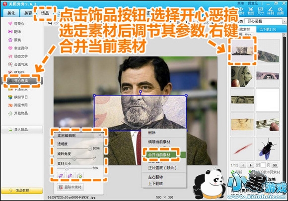 STEP2:添加恶搞素材。点击饰品菜单,选择开心恶搞,挑选合适的钱币素材,调节好素材的大小、角度,使之尽量与照片人物轮廓契合,右键合并当前素材。