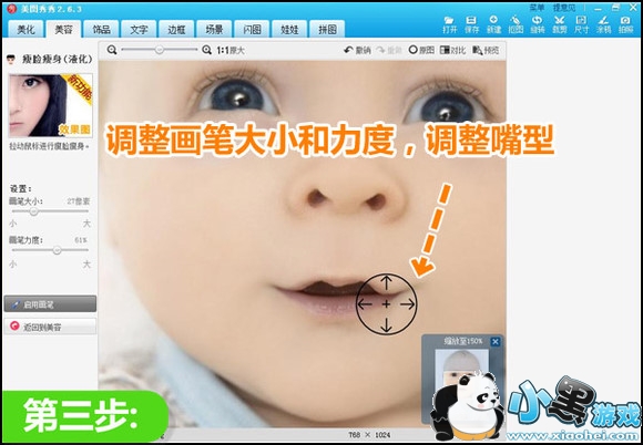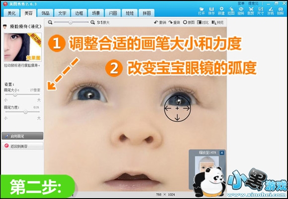 1.处理前,首先需要下载安装“美图秀秀”软件,启动后打开一张宝宝照片,进入“美容”菜单,选择“瘦脸瘦身”(液化)来处理眼睛。可以将图片放大,方便细节处理。