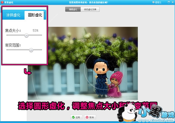 背景虚化小贴士:虚化是为了突显主题,分清宾主,如果背景很杂,就虚化的多一些,不是很杂,就少一些吧。同样,在美图秀秀中,如果想让虚化更随意自然一点就用“涂抹虚化”;而如果是一些静物照片,为了表现近焦效果,这个新增的“圆形虚化”功能就很有用了。