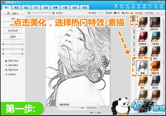 1.先启动“美图秀秀”软件,打开原图后,进入“美化”菜单下,选择“热门特效”里的“素描特效”,一键速成相当简单哦。