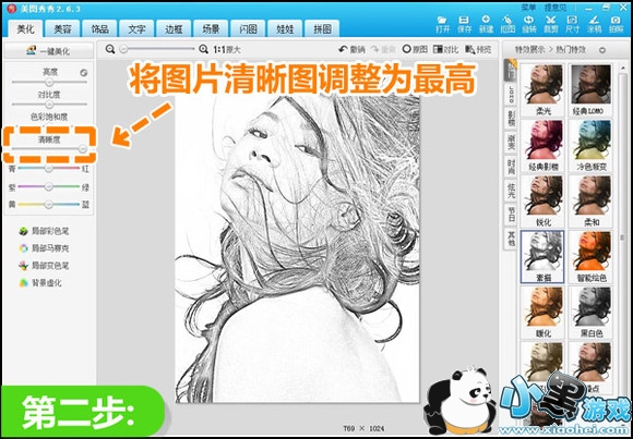 2.为了让素描效果中的线条感更加明显,可将图片的清晰度调整到最高。