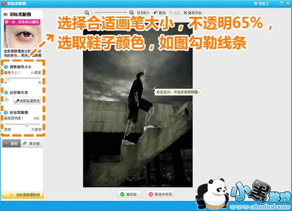 2、接着继续选择“消除黑眼圈”功能,取鞋子的白色,并调节较小的画笔勾勒一下四肢和脸部的轮廓。