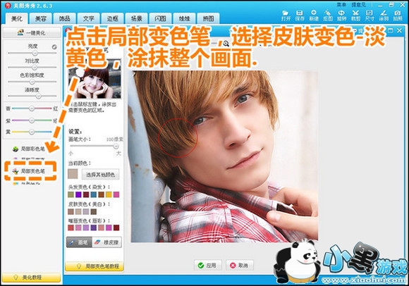3.同样在“美化”菜单下,点击“局部变色笔”按钮,选择皮肤变色,选黄色系颜色,涂抹整个画面,让照片蒙上一层暖暖的阳光。