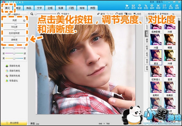 2.接着返回“美化”菜单下,在左侧功能栏中适当地调节亮度、对比度、清晰度。