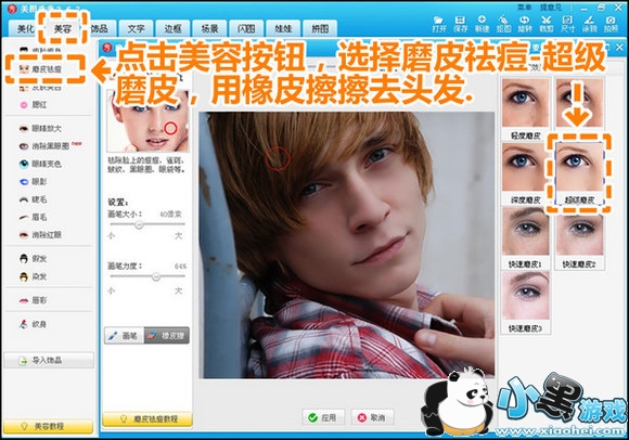 1.启动“美图秀秀”软件,进入“美容”菜单,选择“磨皮祛痘-超级磨皮”,在再用橡皮擦擦去头发、眼睛等部位,还原五官细节。