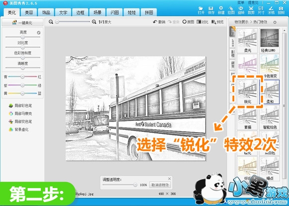 1.打开原图后,进入“美化”菜单下,选择“热门”特效分类里的“素描”,并默认透明度为100%。