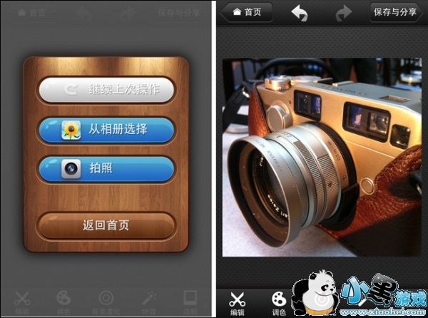PC版的美图秀秀就一直以窗口叫起速度快、做图过程高效着称,美图秀秀iPhone版自然也不例外。尽管有新的效果素材加入,但美图秀秀iPhone1.0.7新版在手机端的启动速度依然迅速,启动后的木纹背景界面还是那么简洁清爽,很舒服,如图1所示。