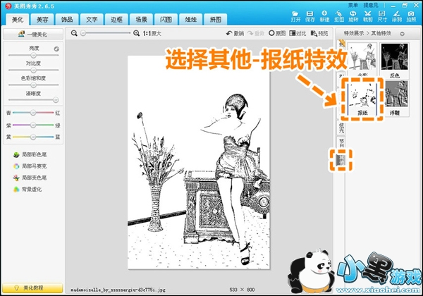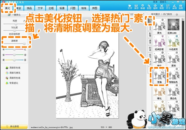 点击美化菜单,选择热门-素描特效,并将左侧的清晰度调整为最大值。