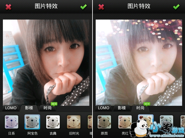打开一张图片经过适量裁减后,就可以进入图片美化的重头戏--特效。点击屏幕下方的特效按钮,选择喜欢的特效后就可以在屏幕上看到作用在照片上的效果了。还可以直接在照片上左右滑动手指,用以切换特效。