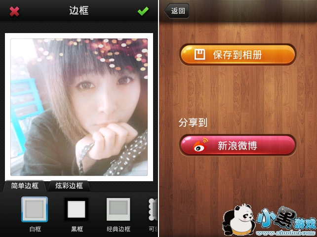 一张精致的图片处理好后,点击右上方绿色勾确定,在新窗口中点击上方的“保存到相册”,就能将图片保存到手机上,稍后可以直接在微博客户端调用已保存好的图片作为头像。同样,点击下方的“分享到新浪微博”就可以直接通过微博发布了。