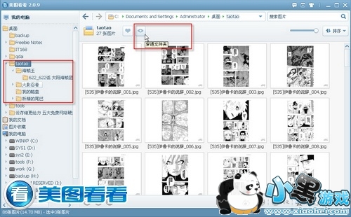 而在美图看看中看漫画就会很方便:美图看看的“一键穿透文件夹”功能可让我们一键直达文件夹底层,将所有子文件夹中的图片一览无余的呈现到你面前(如图01所示)。这就很适合我们宅人看漫画,下载的漫画经常会“一话”一个文件夹,用美图看看的“一键穿透文件夹”功能,整部漫画都能一次性轻松看完了。