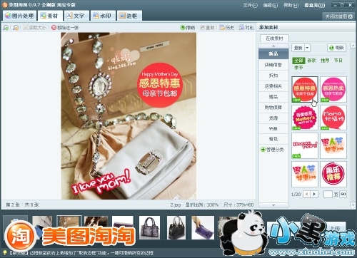 经过美图淘淘简单处理后的宝贝照片,是不是更富节日气息?让买家更有购买冲动呢?你也可以让自家的宝贝照片变成这样哦!在美图淘淘中可以批量导入多张要美化的宝贝图片,在“素材→新品”分类素材下,找到美图淘淘专为母亲节量身打造的节日素材(如图03所示)。一键点击即可将美化素材同时添加到导入的多张照片上,相当方便吧?