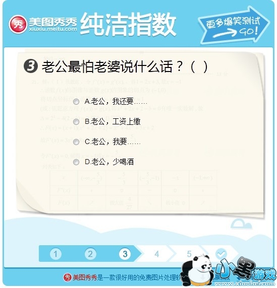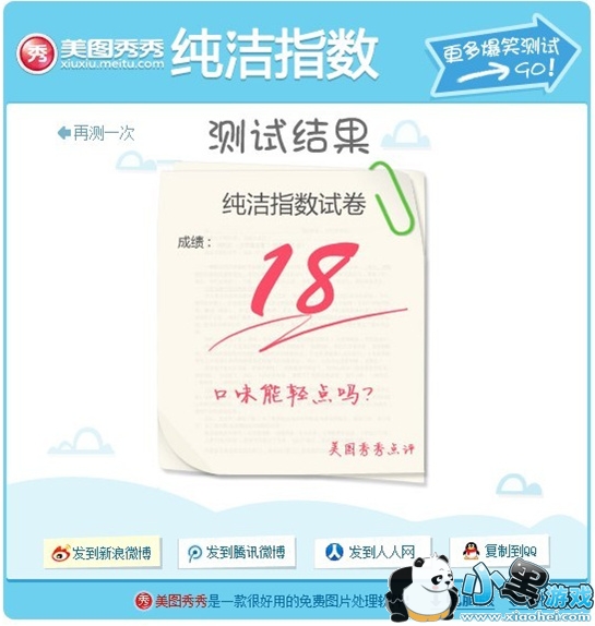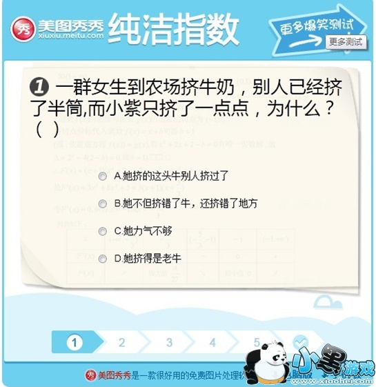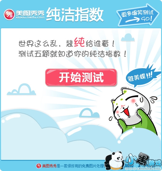 在参加测试前,请跟着小编默念三遍“世界这么乱,装纯给谁看……”,未满18岁的童鞋们请在父母指导下参与答题。言归正传,看官们请先进入美图秀秀纯洁指数测试网址:http://12.app.meitu.com/,题目非常多,每次只能做5道,可以重复做,全程佚名保密哦。