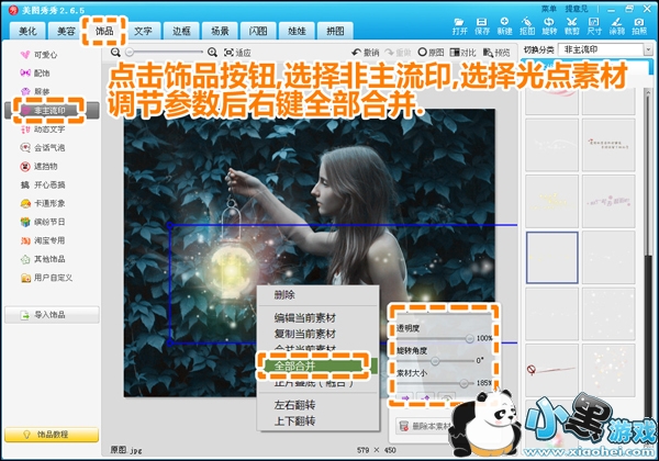 2、接着进入“饰品”菜单,选择“非主流印”分类,挑选满意的光点渲染素材,调节大小和透明度、位置等参数,并鼠标右键“全部合并”,开始营造超出现实的梦幻氛围。