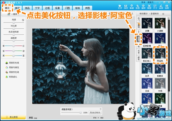 1、启动“美图秀秀”软件,并进入“美化”菜单下,选择“影楼”分类下的“阿宝色”特效,给照片瞬间变换一种神秘偏青色的暗背景效果。