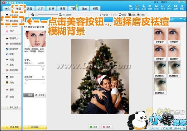 2.接着进入“美容”菜单下,选择“磨皮祛痘”功能,调节合适的画笔大小与适当的画笔力度,涂抹背景使其适当模糊,制造景深,突出的情侣人物。同时还可以适当优化人物的皮肤。