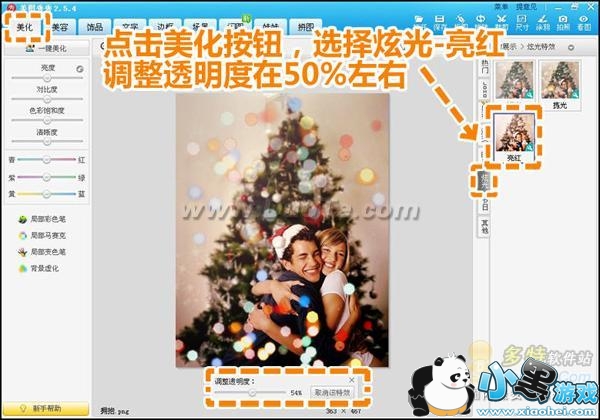 4.再进入“美化”菜单下,选择“炫光”分类中的“亮红”特效,并将透明度调到50%左右。