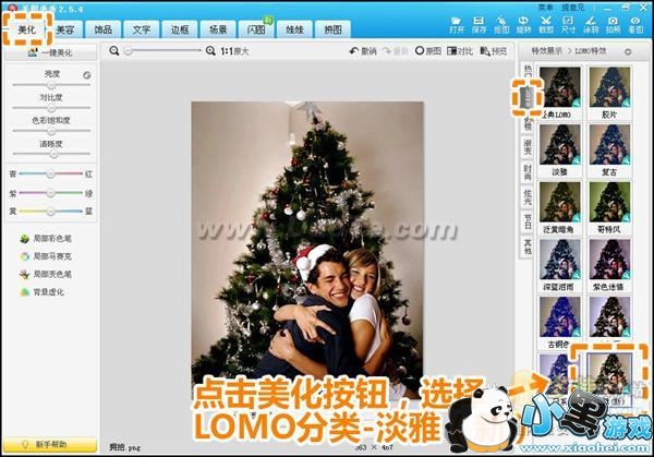 1.在“美图秀秀”软件下打开待处理的情侣合影,进入“美化”菜单下,选择lomo分类-淡雅(新),可以瞬间调节画面的色调和亮度。