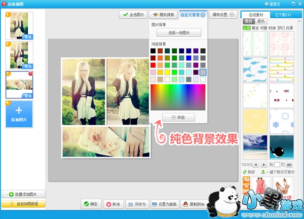 而 “自定义背景”设置,能让用户轻松实时预览和选择纯色背景效果(如图2),或者换一张自己存的图片做背景(如图3),让用户充分发挥DIY的拼图乐趣。