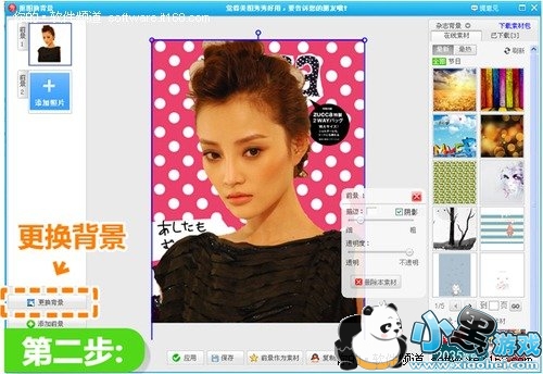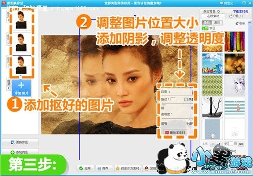 第三,先在左侧选择“添加照片”,将刚才抠好的前景图片多添加几个进来。再依次调节前景图片的位置大小,以及阴影、透明度等细节,让图片呈现一种渐变的效果。