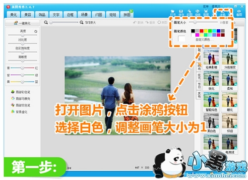 第一步:打开一张要处理的图片,选择“涂鸦”工具,将画笔颜色选为白色,大小调节为1。
