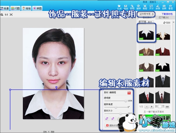 拍证件照要求着装整齐,尤其是将要毕业找工作的同学们,证件照着装更是不能马虎。如果没有像样的行头也没关系,可以在“饰品”—“证件照专用服装”中选择一款正装。