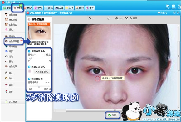 眼袋是抹掉了,可万恶的黑眼圈还是让人显得很憔悴,这时用“去除黑眼圈”功能就能解决麻烦。另外,使用“唇彩“功能给嘴唇换个亮丽的颜色会让人看上去更精神哦。