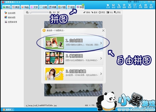 首先、用美图秀秀打开任意一张要处理的照片,然后选择“拼图”界面里的“自由拼图”功能。要把两个时期的照片放在一起,才能看得出对比效果。