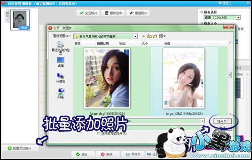 第二、选择“自由拼图”后会跳出编辑框,单击左下角的“批量添加照片”以打开第2张照片。