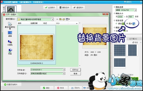 第三、添加完图片,我们要找一张有怀旧感的图片作为背景。直接选用“美图秀秀”软件自带的海量背景也不错!选好后,选择下图所示的替换背景图片处打开即可。